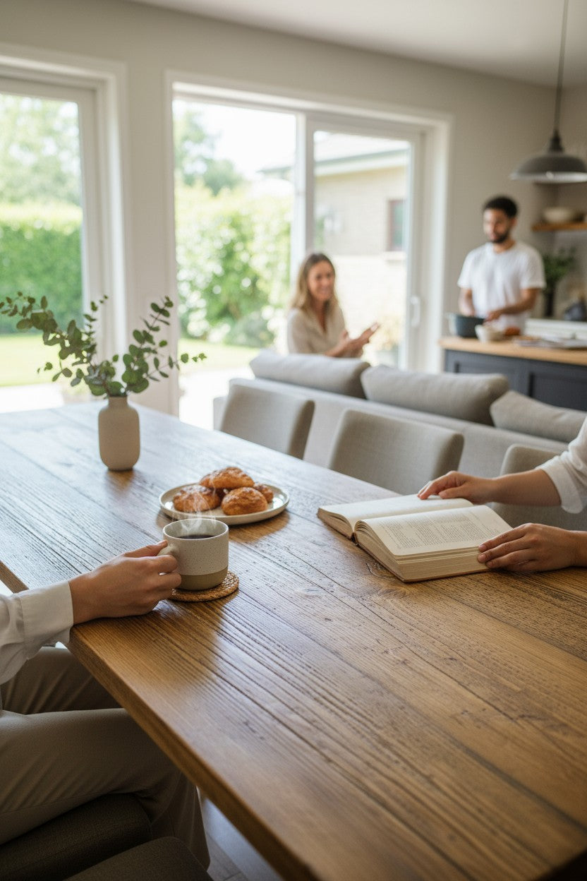 Reclaimed pine is full of natural character, with warm tones, knots, and timeworn marks that create stunning table surfaces. It's an eco-friendly choice that helps reduce waste while bringing authentic character to your dining or workspace.