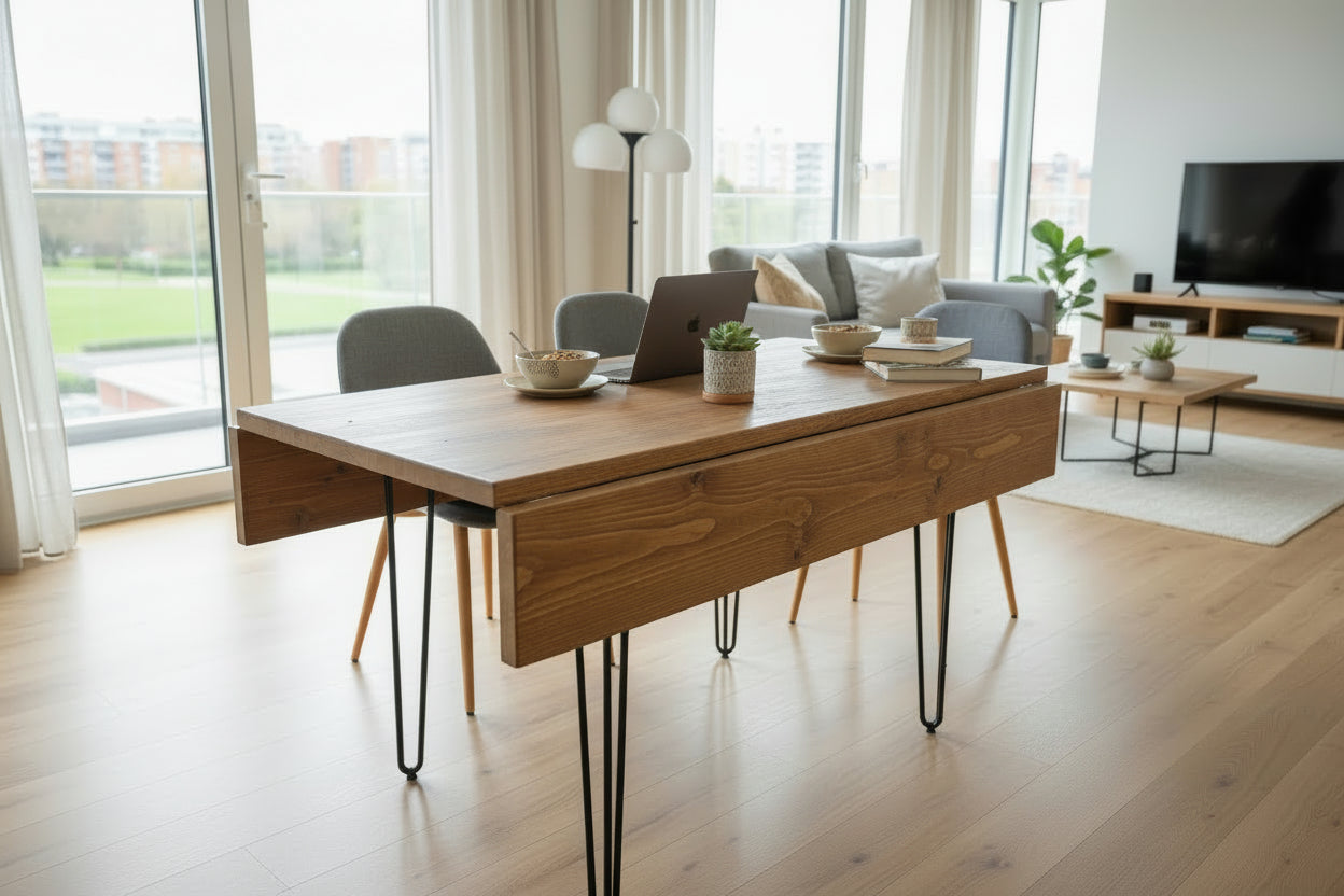 Drop leaf dining tables feature hinged sides that fold down to create a compact footprint when not in use. Simply lift the leaves when you need extra dining space for guests or family meals. This makes our drop leaf dining table one of the most practical extendable dining tables for modern living—you get a full-size dining room table when you need it, and a space-saving kitchen table the rest of the time.